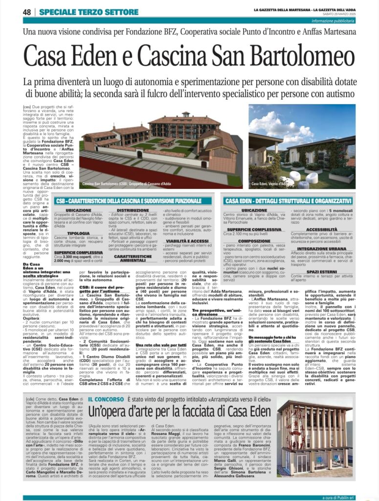 La decisione è frutto di una riflessione condivisa tra Fondazione BFZ, Cooperativa Punto d’Incontro e Anffas Martesana, che ha portato a una visione più ampia, capace di valorizzare le caratteristiche uniche di Casa Eden: la posizione centrale, il contesto urbano, la vicinanza a servizi e reti sociali.